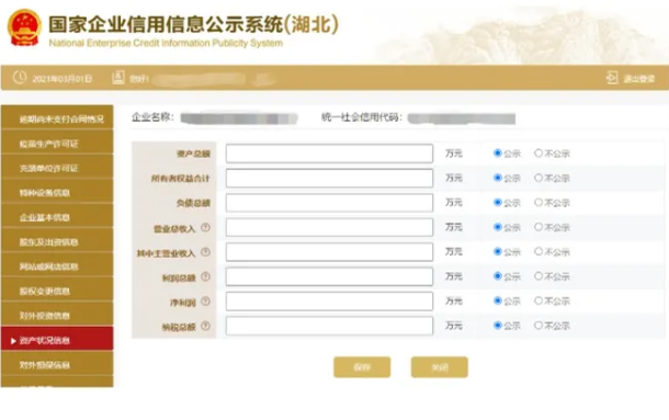資產狀況信息 進入資產狀況信息頁面 填寫信息,點擊保存 企業自行選擇是否進行公示。