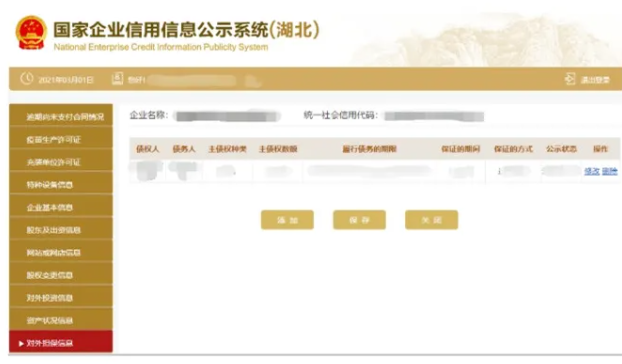 對外擔保信息 進入對外擔保信息頁面 填寫信息 點擊保存 可添加多條信息也可修改或刪除。